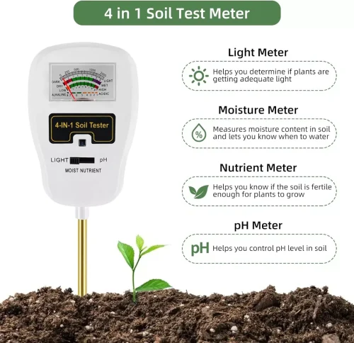 Función 4 en : este medidor de prueba de suelo especialmente diseñado es capaz de medir la humedad del suelo, el valor de pH, el nivel de luz solar y el contenido de nutrientes en un solo dispositivo, proporcionando información rápida sobre el estado del suelo para un mejor cuidado de las plantas.